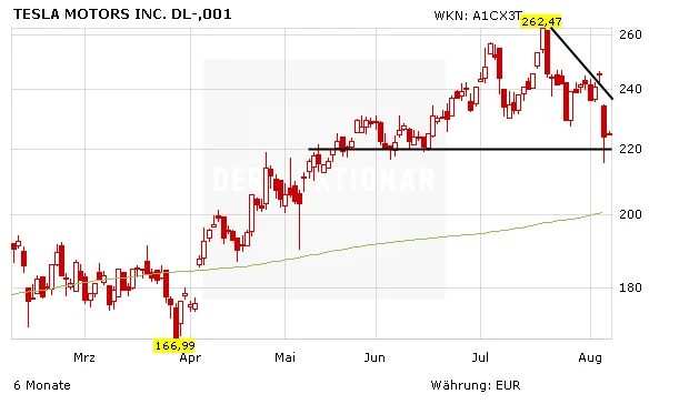 Für den Tesla-Titel schaut es aktuell nicht gut aus. Die Aktie ist infolge der Quartalszahlen am Donnerstag um neun Prozent eingebrochen. Die Börsianer reagierten enttäuscht darauf, dass die Jahresprognose von 55.000 weltweit verkauften Autos auf 50.000 bis 55.000 Fahrzeuge herunterkorrigiert wurde.