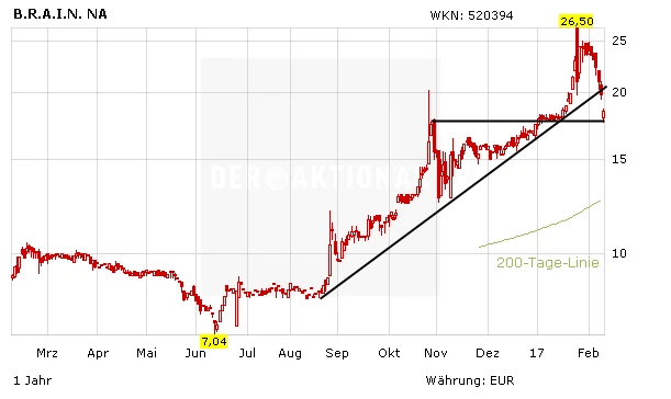 Die veränderte Aktionärsstruktur beeinflusst in keinster Weise die fundamentale Entwicklung von BRAIN. Risikobewusste Anleger nutzen das aktuelle Kursniveau zum Kauf. Der Stopp sollte bei 15 Euro platziert werden.