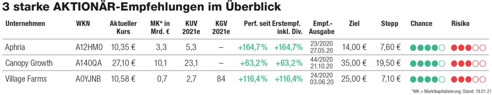 Besonders stark entwickelte sich in den letzten Wochen die Aktie von Aphria. Das Unternehmen hat im Dezember mit Tilray eine Fusionsvereinbarung geschlossen. Damit kann der größte Cannabisproduzent der Welt entstehen. Läuft alles nach Plan, soll Aphria-Chef Irwin Simon das fusionierte Unternehmen führen. Tilray-Chef Brendan Kennedy soll dem Verwaltungsrat angehören. Mit dem Zusammenschluss will Aphria in die USA expandieren und weitere Wachstumsmöglichkeiten nutzen. Hierzu gehört den Angaben zufolge auch der Markt für medizinisches Cannabis in Deutschland.