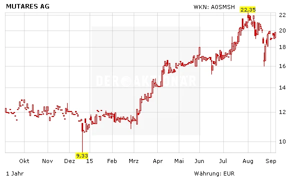 Damit liegt der NAV (Net Asset Value) des Mutares-Konzerns aktuell bei 351,2 Millionen Euro. Umgerechnet sind das 25,02 Euro pro Aktie. Somit liegt der NAV deutlich um 28 Prozent über der aktuellen Marktkapitalisierung.