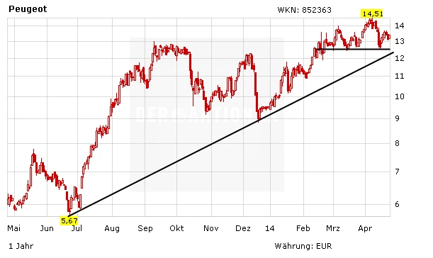 Während der DAX am Freitag schwächelt, kann die Aktie des französischen Autobauers Peugeot zulegen. Obwohl der starke Euro das Ergebnis zum Jahresstart bremste, ist die wachsende Nachfrage nach den Marken Peugeot und Citroen ein Indikator für die zunehmende Erholung des angeschlagenen PSA-Konzerns.