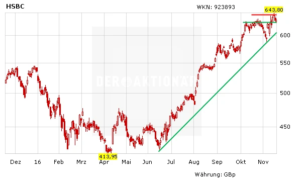 Die HSBC kannte zuletzt kein Halte mehr und hat bei 6,43 Pfund ein neues Jahreshoch erreicht. Mit der Expansion in Asien sind die Weichen für die Zukunft gestellt, der nächste Widerstand lauert im Bereich von 6,40 Pfund (7,44 Euro Euro). Bei einem Kurs-Buchwert-Verhältnis von 0,9 und einer Dividendenrendite von fast sechs Prozent ist die Aktie immer noch günstig. Anleger können weiter zugreifen, die nächste Unterstützung liegt bei 6,25 Pfund (7,27 Euro).