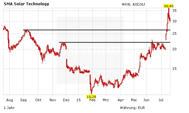 Eine Woche lang war der Wechselrichterproduzent SMA Solar das bestimmende Thema am deutschen Aktienmarkt. Innerhalb von wenigen Tagen schoss das Papier von knapp 20 auf über 36 Euro. Mittlerweile ist wieder etwas Ernüchterung eingekehrt und der Kurs auf 30 Euro zurückgekommen. Heute gibt es noch einmal Gegenwind aus Düsseldorf.