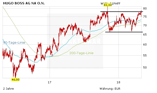 Die Hugo-Boss-Aktie reagierte am Mittwoch mit heftigen Kursschwankungen auf das Zahlenwerk. Binnen Minuten ging es zwischen 75 Euro und dem neuen 2018er-Hoch bei knapp 79 Euro mehrmals hin und her. Am Mittag notierte der MDAX-Wert bei 77 Euro.