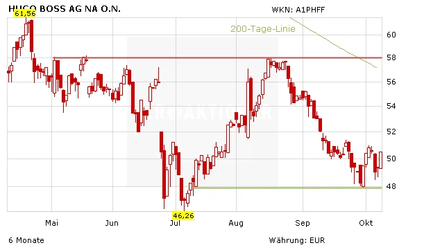 Die schwachen Aussichten für die Modebranche belasten die Aktien von Hugo Boss schon lange. Dazu muss man kein Aktienkenner sein, ein Blick auf den Chart genügt. Der Kurs war im Juli auf ein Mehrjahrestief bei 46 Euro gefallen. Zum Vergleich: Im April 2015 hatten die Papiere noch ein Rekordhoch bei knapp 120 Euro erreicht.