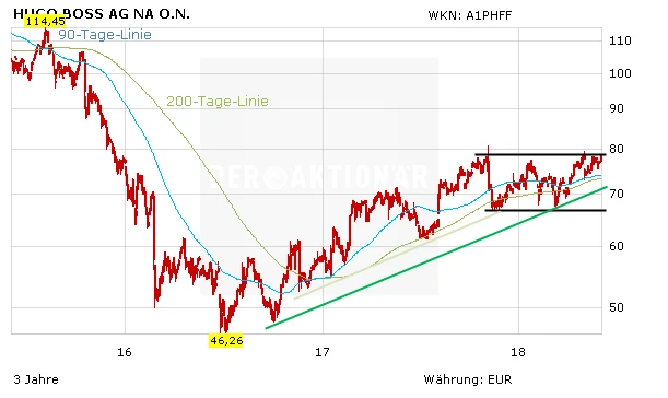 Die Hugo-Boss-Aktie läuft weiterhin in einer Seitwärtsschiebezone zwischen 67 und 79 Euro. Ein nachhaltiger Ausbruch nach oben eröffnet charttechnisch ein sattes Kurspotenzial bis etwa 95 Euro. Selbst die alten Höhen jenseits der 100-Euro-Marke sind dann längerfristig denkbar.