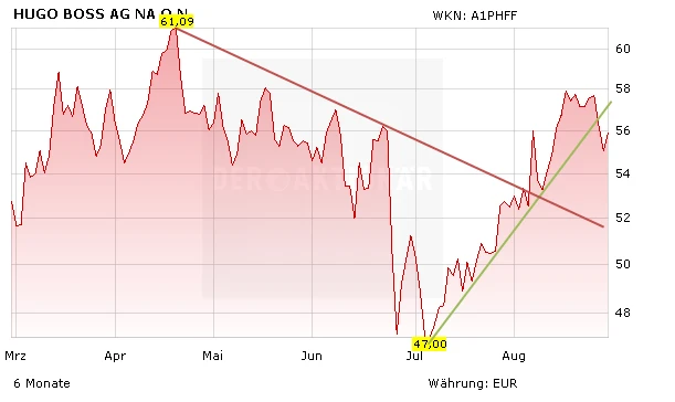 Vor allem Schnäppchenjäger sind mit Titeln wie Hugo Boss gut beraten. Die Aktie sollte Anfang Juli ihren Boden bei 47,00 Euro gefunden haben. Seit da an geht es langsam, aber stetig bergauf. Der nächste Widerstand liegt bei 61,09 Euro. Was Anleger tun müssen? Dabeibleiben und der Marke vertrauen.