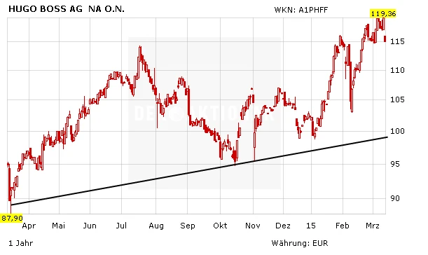 2014 hatten das ungünstige Wetter, die Russland-Krise und eine nachlassende Kauflaune die Geschäfte bei Hugo Boss erschwert. Deshalb wurde die ohnehin bereits im November gesenkte Prognose nur mit Mühe erfüllt. Der Umsatz stieg um sechs Prozent auf 2,57 Milliarden Euro und das operative Ergebnis kletterte um fünf Prozent auf 591 Millionen Euro. Bereits im Februar hatte der Konzern erste Eckdaten für das abgelaufene Geschäftsjahr vorgelegt. Für die Aktionäre gab es aber auch erfreuliche Nachrichten: So will Hugo Boss trotz der Probleme eine um acht Prozent höhere Dividende von 3,62 Euro je Aktie zahlen. Dies entspricht auf dem aktuellen Niveau einer Rendite von drei Prozent.