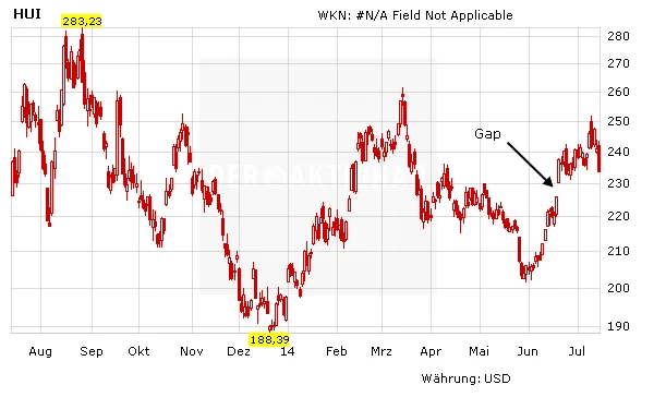 Und eine solches Gap hat der Goldminenindex HUI mit dem Goldpreisanstieg von über 40 Dollar vor rund zwei Wochen aufgetan. Zunächst sah vieles danach aus, als ob es sich dabei um ein Break-away-Gap handelt. Doch mittlerweile deutet vieles darauf hin, dass dieses Gap erst wieder geschlossen werden muss, bevor es bei Barrick, Goldcorp und Co wieder nach oben gehen kann.
