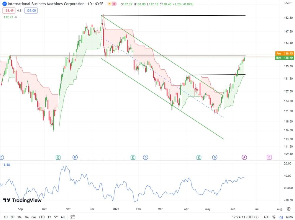 Befeuert von dieser positiven Nachricht nähert sich der Kurs der wichtigen Horizontalen bei 139,27 Dollar. Zuvor ist es IBM bereits gelungen, das April-Hoch bei 132,74 Dollar hinter sich zu lassen. Rückenwind gab es dabei vom Momentum- und dem Supertrend-Indikator, deren Kaufsignale immer noch aktiv sind. Wichtig ist jetzt, dass die Bullen den Widerstand bei 139,27 Dollar überwinden können. Gelingt dies, stehen die Chancen für eine Rückkehr zum Dezember-Hoch bei 153,28 Dollar gut.