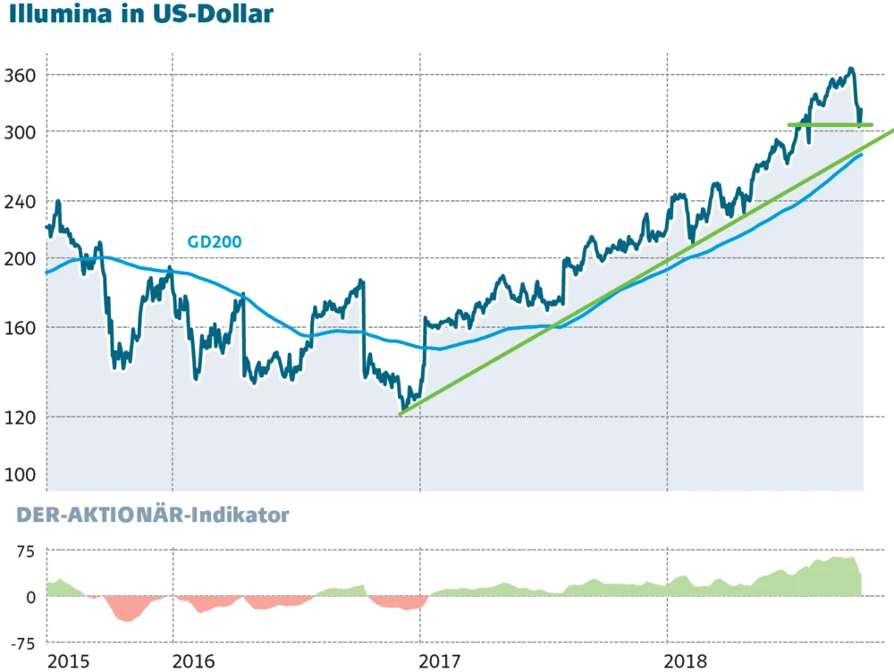 Die exzellenten Zukunftsaussichten spiegeln sich seit Jahren in einer hohen Bewertung der Illumina-Aktie wider. Im schwachen Gesamtmarkt hat es auch dieses Papier erwischt. Investierte Anleger beachten den Stopp bei 235,00 Euro und halten an der Rest-Position fest.
