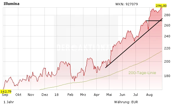 Wie das Handelsblatt berichtet, kommen die speziellen Gensequenzierer mittlerweile auch in München zum Einsatz. Die Illumina-Technologie sei die einzige, die es derzeit schafft, ein Genom mit 3,27 Milliarden Basenpaaren vollständig zu sequenzieren. Dass der Diagnostik-Spezialist auf eine ungebrochene Nachfrage trifft, haben die jüngsten Zahlen zum zweiten Quartal 2018 eindrucksvoll unter Beweis gestellt. Illumina schraubte die Umsätze um 25,4 Prozent auf 830 Millionen Dollar nach oben, beim Cashflow verbuchte der Diagnostik-Konzern ein Plus von 65,7 Prozent. Beim Ergebnis je Aktie legte Illumina sogar satte 74,4 Prozent auf 1,43 Dollar pro Papier zu. Rekord! Die logische Konsequenz: eine Erhöhung der Jahresprognose. Die Amerikaner rechnen nun mit einem Ergebnis zwischen 5,10 und 5,20 Dollar. Zuvor hatte Illumina 4,45 bis 4,55 Dollar in Aussicht gestellt.
