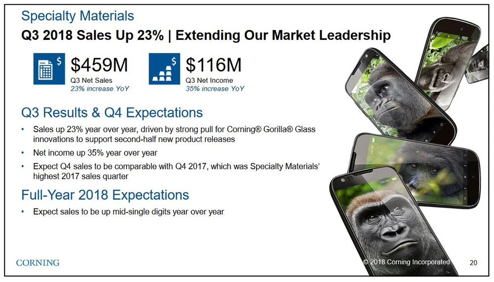 Während im abgelaufenen Quartal der Umsatz in allen Segmenten zulegte (Display Technologies +7%; Optical Communications +22%; Environmental Technologies +19%; Life Sciences +4%), stach das Geschäftsfeld Speciality Materials heraus. Hier bilanziert Corning seine Geschäfte rund um das „Gorilla Glass“, ein besonders gehärtetes Spezialglas, das beispielsweise bei Smartphones verbaut wird. Abseits davon profitiert Corning vom Trend "Gorilla Glass" in Autos einzusetzen. Hier tut sich gerade ein neuer Markt auf, was sich bereits im vergangenen Quartal im rasanteren Wachstum von 23 Prozent niederschlägt.
