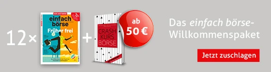 Nutzen Sie das einfach börse-Willkommenspaket und lesen Sie ein Jahr lang alle einfach börse-Ausgaben für 50 Euro und sparen 10 Euro gegenüber dem Einzelbezug. Dazu erhalten Sie das Börsenbuch „Crashkurs Börse“ als Geschenk – ein Grundlagen- und Nachschlagewerk für Einsteiger und Fortgeschrittene.