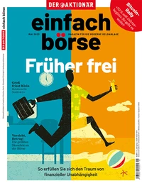 einfach börse ist das Monatsmagazin der Redaktion von Deutschlands führendem Börsenmagazin DER AKTIONÄR. Alle 4 Wochen liefert Ihnen einfach börse umfangreiche Tipps und Informationen rund um ein aktuelles Schwerpunktthema. Darüber hinaus werden Erfolgsstrategien von Unternehmen und Persönlichkeiten in Porträts vorgestellt, Sie erhalten Einblicke in Investitionsmöglichkeiten außerhalb von Aktien und Co sowie weiteres unterhaltsames und lohnenswertes Wissen rund um die moderne Geldanlage.