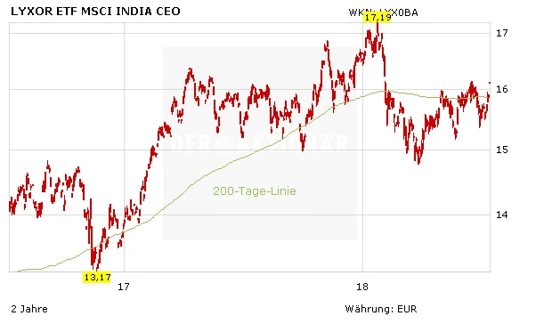 Wer weiterhin auf die indischen Märkte setzen will, kann auf den Lyxor ETF MSCI India (WKN: LYX0BA) zurückgreifen. Die jährlichen Kosten des Fonds betragen 0,85 Prozent. DER AKTIONÄR sieht das Ziel bei 20,00 Euro und setzt den Stopp bei 13,50 Euro.