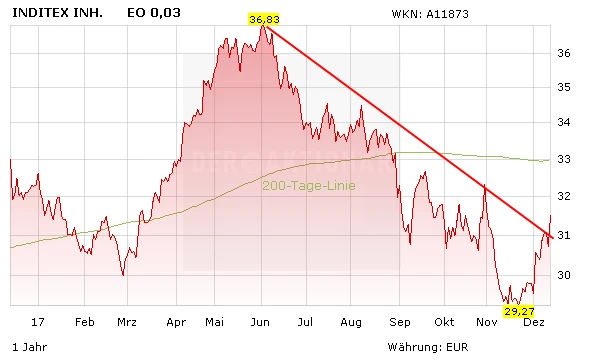 Die Inditex-Aktie schickt sich an, mit dem aktuellen Kurssprung um zeitweise gut vier Prozent auf 32 Euro einen mittelfristigen Abwärtstrend nach oben zu verlassen. Gelingt auch der Sprung über die 200-Tage-Linie bei 33 Euro nachhaltig, ist der Weg frei zum Allzeithoch bei 36,83 Euro, das Anfang Juni markiert wurde. Mega-Kurssprünge darüber hinaus sind jedoch vorerst nicht zu erwarten.