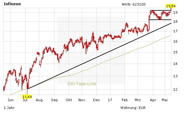 Zuletzt hatte die Infineon-Aktie 2002 mehr gekostet als am heutigen Montag. Dank des positiven Branchenumfelds und gut laufender Geschäfte mit der Automobilindustrie ist die Aktie seit Monaten einer der Top-Performer im DAX. Auf Sicht von zwölf Monaten steht ein Plus von knapp 60 Prozent zu Buche. Seit der Anhebung der Prognose Ende März war die Rallye allerdings etwas ins Stocken geraten.