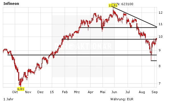Anfang August wurde die Infineon-Aktie ausgestoppt, der Titel ist allerdings nach wie vor auf der Watchlist des AKTIONÄR. Vor einem Einstieg sollten Anleger im volatilen Marktumfeld allerdings die klare Trendwende abwarten. Gelingt der nachhaltige Sprung über 9,80 Euro, wäre dies ein starkes Zeichen.