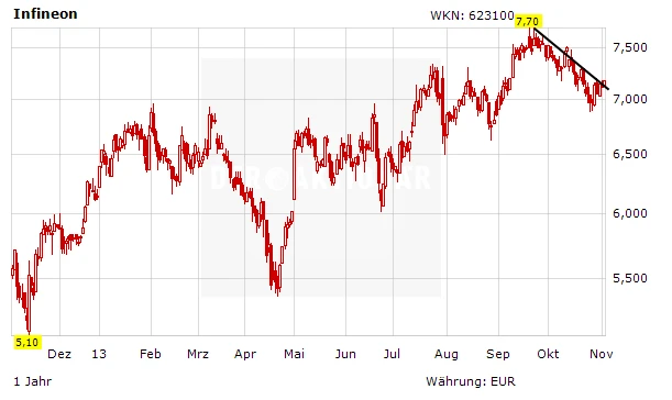 Richtig spannend wird es am 12. November, wenn der Halbleiterkonzern seine Ergebnisse für das vierte Geschäftsquartal vorlegen wird. Analysten rechnen im Schnitt mit Erlösen von 1,06 Milliarden Euro sowie einem bereinigten Gewinn von 0,10 Euro pro Aktie.