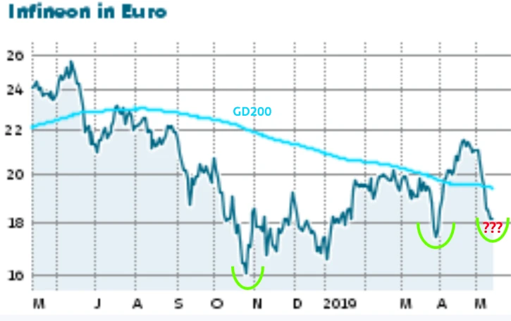 In den vergangenen Wochen hat sich die Aktie von Infineon Technologies recht volatil präsentiert. Mit der Umsatz- und Gewinnwarnung für das Gesamtjahr ging der Kurs in die Knie und markierte ein Tief bei 17,10 Euro. Die anschließende Erholung führte den Kurs ebenso schnell auf ein neues Jahreshoch bei 21,62 Euro. Mit dem verschärften Ton im Handelsstreit fielen die Papiere wieder zurück. Die jüngsten Quartalszahlen brachten keine frischen Impulse, die gesenkte Prognose wurde bestätigt.