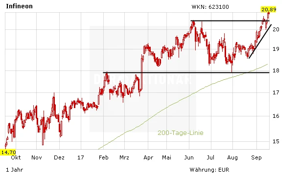 Die Infineon-Aktie ist auf den höchsten Stand seit Mai 2002 geklettert. Im freundlichen Marktumfeld ist damit der nachhaltige Ausbruch aus dem mittelfristigen Seitwärtstrend gelungen. Dank der neuen Megatrends in der Automobilbranche und der starken Position in China könnte die Rallye noch weitergehen.