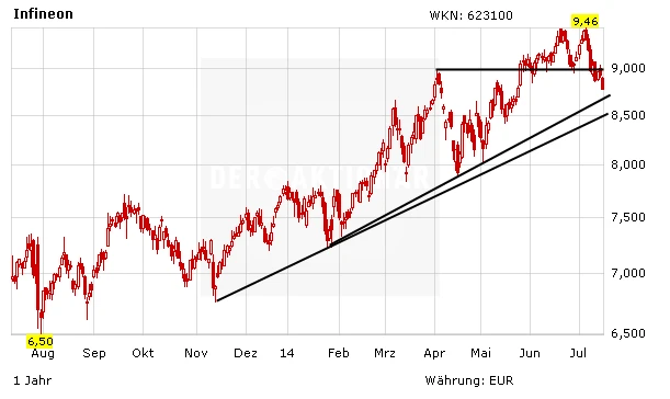 Die Papiere des Chipherstellers Infineon befanden sich zuletzt auf Konsolidierungskurs. Die horizontale Unterstützung bei 9,00 Euro wurde zuletzt nachhaltig unterschritten. Damit wurde ein Verkaufssignal ausgelöst, der den Aufwärtstrend gefährden könnte.