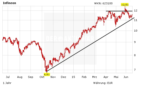 Anfang Juni hat Infineon ein Mehrjahreshoch markiert. Mit den positiven Analystenkommentaren im Rücken dürfte es nur eine Frage der Zeit sein, bis die Aktie ihren Aufwärtstrend wieder aufnimmt. Auch fundamental sieht es gut aus. Der Chipkonzern befindet sich immer noch im Wachstumsmodus. Im zweiten Quartal ist der Umsatz von Infineon im Vergleich zum Vorquartal um 31 Prozent auf 1,48 Milliarden Euro geklettert. Das operative Ergebnis legte um 17 Prozent auf 198 Millionen Euro zu. Investierte Anleger bleiben dabei.