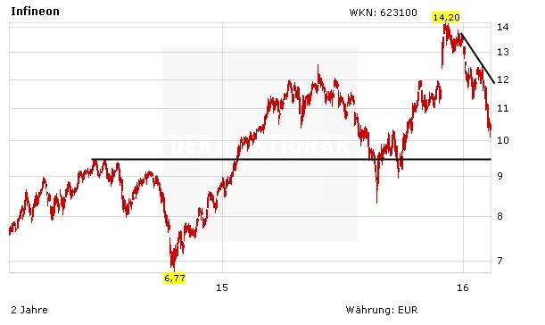 Charttechnisch hat sich die Situation bei Infineon zuletzt wieder eingetrübt. Nachdem der DAX-Titel zwischen Oktober und November 2015 noch zu einer beeindruckende Rallye angesetzt hatte, zeigt der Weg seit dem Mehrjahreshoch Ende November nur noch nach unten. Im schwachen Marktumfeld ist derzeit noch keine Trendwende in Sicht. Eine massive Unterstützung findet der Kurs zudem erst wieder im Bereich von 9,50 Euro.
