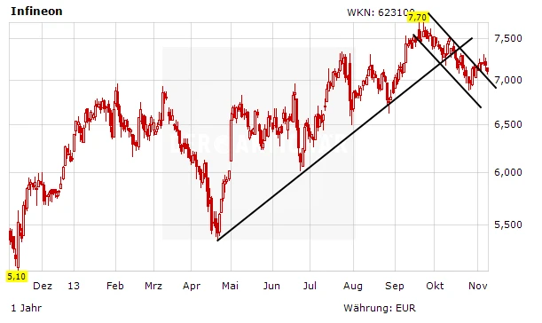 Aus charttechnischer Sicht ist es jetzt wichtig, dass die Infineon-Aktie nicht wieder in den kurzfristigen Abwärtstrend, der aktuell bei 6,96 Euro verläuft, zurückfällt. Bedenklich ist ohnehin, dass der mittelfristige Aufwärtstrend bei 7,69 Euro schon länger gebrochen ist.