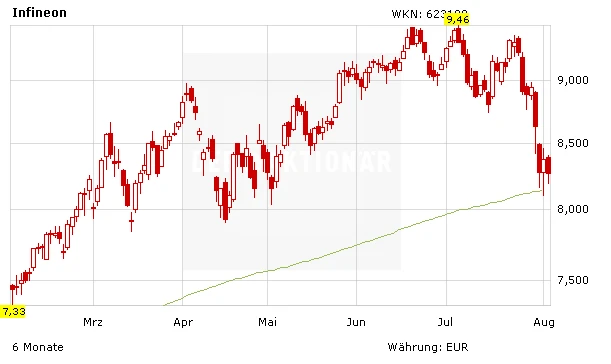 DER AKTIONÄR sieht den jüngsten Kursrutsch zwar als übertrieben. Kurzfristig ist die Aktie von Infineon jedoch erst einmal angeschlagen. Aus charttechnischer Sicht ist es nun wichtig, die 200-Tage-Linie zu verteidigen, die derzeit bei 8,14 Euro verläuft. Anleger sichern ihre Position mit einem Stopp bei 7,30 Euro nach unten ab.