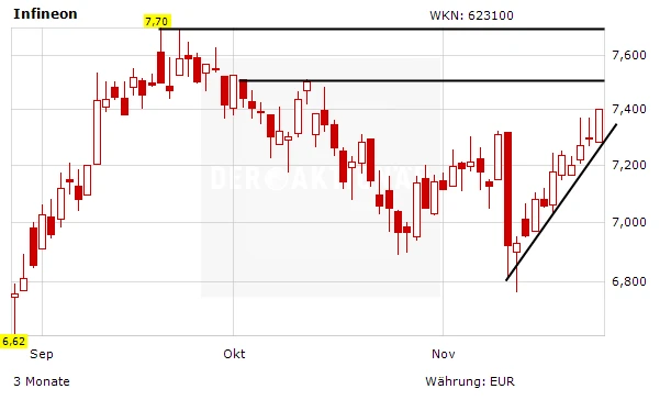Die Aktie des Chipherstellers Infineon läuft und läuft und läuft. Die Hürde im Bereich von 7,35 Euro hat die Aktie inzwischen hinter sich gelassen. Jetzt rücken die nächsten Widerstände bei 7,50 und 7,70 Euro in den Blick.