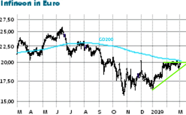 DER AKTIONÄR verfolgt die Entwicklung der Infineon-Aktie sehr engmaschig und hat bereits erklärt, dass sich der Titel seit dem 25. Januar im Konsolidierungsmodus befindet. Dabei hat sich bei 20,00 Euro ein horizontaler Widerstand herauskristallisiert. Ein Versuch, diese Hürde nachhaltig zu überwinden scheiterte am 25. Februar. Mittlerweile pendelt der Kurs in einer engen Range zwischen 18,50 auf 20,00 Euro seitwärts.