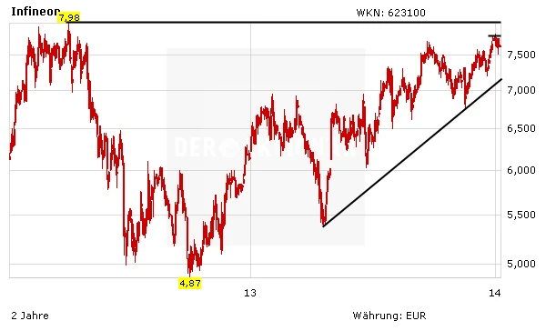 Aktuell notiert der DAX-Titel knapp unter dem Widerstand bei 7,80 Euro. Gelingt der Ausbruch, ist vorerst Luft bis zur 8,00-Euro-Marke. Für zusätzlichen Rückenwind dürften auch die positiv aufgenommenen Zahlen des US-Halbleiterwertes Micron Technology sorgen, die am Mittwoch mit fast zehn Prozent aus dem Handel gingen.