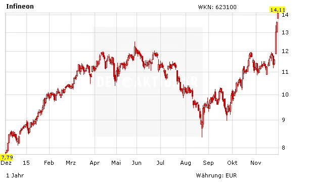 Bereits in der Vorwoche hatten zahlreiche Analysten ihre Bewertungen für den deutschen Chiphersteller angepasst, nachdem Infineon erfreuliche Geschäftszahlen und einen optimistischen Ausblick präsentiert hatte. Anschließend war die Infineon-Aktie innerhalb von nur zwei Tagen um mehr als 17 Prozent nach oben geschossen.