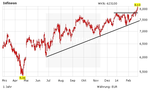 Die Aktie des Chipherstellers Infineon ist nach mehreren vergeblichen Versuchen zuletzt über die massive Widerstandsmarke bei 7,80 Euro ausgebrochen. Beflügelt haben den Kurs die optimistischen Aussagen von Vorstandsvorsitzenden Reinhard Ploss auf der Hauptversammlung.