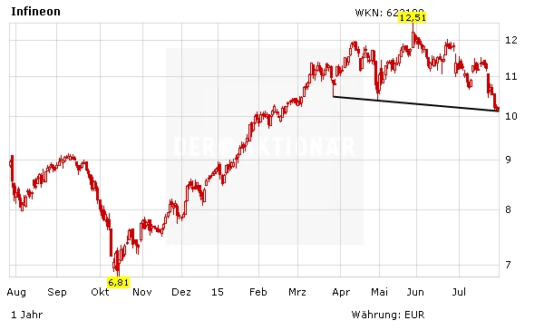 Mit Spannung wird der Ausblick auf das vierte Quartal des laufenden Geschäftsjahres erwartet. Commerzbank-Analyst Thomas Becker geht davon aus, dass der Gegenwind wie die Probleme der chinesischen Wirtschaft oder ein nachlassender Boom bei Smartphones für Infineon zunehmen wird. Daher rechnet Becker zwischen Juli und Ende September mit einem vergleichsweise mageren Quartalswachstum von knapp zwei Prozent.