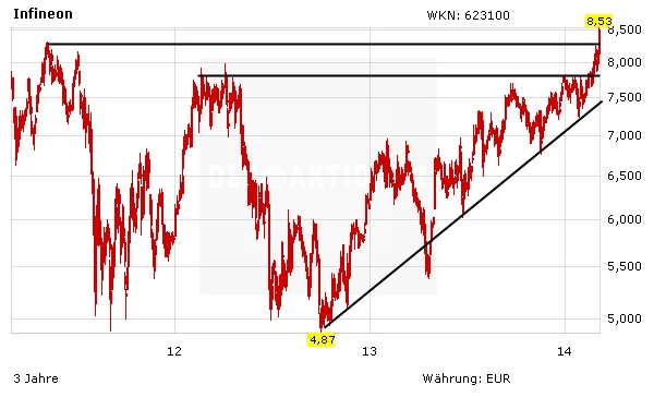 Nachdem der Infineon-Aktie der Sprung über den Widerstand bei 7,80 Euro gelungen ist, nimmt der Wert nun Kurs auf die 10-Euro-Marke. Das Papier des Chipherstellers notierte zuletzt im Oktober 2007 im zweistelligen Bereich. Investierte Anleger bleiben dabei, auch für einen Neuseinstieg ist es noch nicht zu spät. DER AKTIONÄR spekuliert in seinem Derivate-Musterdepot daher weiter auf steigende Kurse.