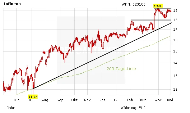 Ende März hatte Infineon überraschend die Prognose angehoben. Die Aktie konsolidiert seitdem auf hohem Niveau. Neue Impulse könnte der Halbleiterhersteller am morgigen Donnerstag, den 4. Mai, erhalten. Experten erwarten für das zweite Quartal erneut ein kräftiges Wachstum.