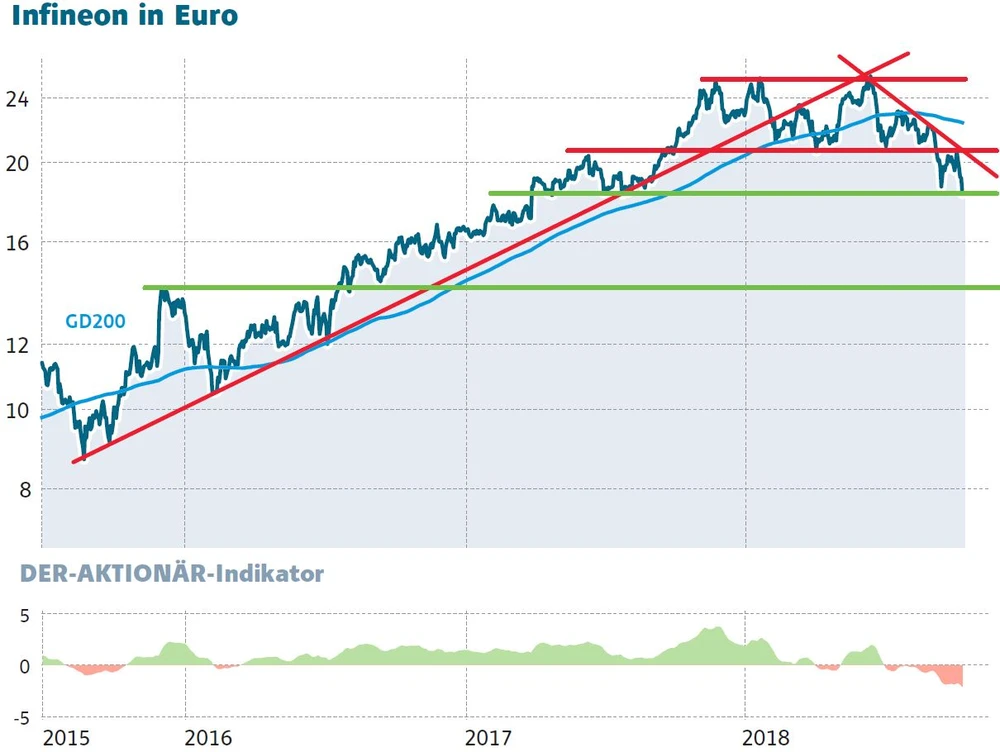 Diese Befürchtungen spiegelt derzeit auch der Optionsmarkt wider. Das Handelsvolumen bei Optionskontrakten liegt 165 Prozent über dem 20-Tage-Schnitt. Die aktivsten Kontrakte sind Puts mit Laufzeit Oktober und November 2018 mit Strike bei 19 beziehungsweise 18 Euro sowie Juni 2019 Put-Kontrakte mit Strike 18 Euro. Das zeigt, dass die Absicherungsaktivität bei Infineon deutlich gestiegen ist. Zudem verkaufen auch institutionelle Anleger, wie zuletzt der norwegische Staatsfonds, der seinen Anteil unter die 3-Prozent-Schwelle reduzierte.