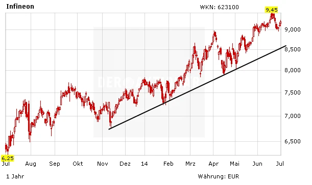 Die Rallye der vergangenen Monate kommt nicht von ungefähr. Infineon profitiert durch die Erholung der Automobilindustrie und dem Trend hin zu mehr mobilen Endgeräten. Die jüngsten Zahlen von Infineon fielen gut aus. Verglichen mit dem Vorquartal hatte Infineon zwischen Januar und März den Umsatz um sieben Prozent auf 1,05 Milliarden Euro gesteigert. Unter dem Strich legte der Überschuss um mehr als 40 Prozent auf 124 Millionen Euro zu.