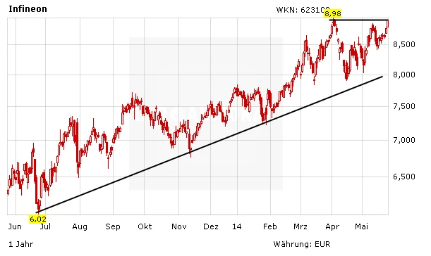 Seit dem Ausbruch über die 8,60-Euro-Marke kennt die Infineon-Aktie kein Halten mehr. Die Aktie führt am Dienstag die Gewinnerliste im DAX an und notiert knapp unter dem Jahreshoch. Nun sorgt eine positive Analysteneinschätzung für zusätzlichen Rückenwind.