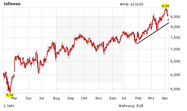 Nach den ausgezeichneten Zahlen zum ersten Geschäftsquartal gibt es mehrere Signale, die bei dem Halbleiter-Konzern Infineon auf eine sich fortsetzende positive Entwicklung deuten. Das Marktumfeld ist weiter sehr gut. Die Chip-Produktion ist voll ausgelastet. Die Produkte für Energieeffizienz und Sicherheit erweisen sich als Wachstumstreiber. Vor allem der Markt für Halbleiter im Automobilbereich dürfte in diesem Jahr weiter anziehen. Der Umsatz soll daher von zuletzt 3,8 Milliarden zwischen sieben und elf Prozent zulegen. Analysten erwarten im Durchschnitt einen Gewinn je Aktie in Höhe von 0,39 Euro (Vorjahr: 0,25 Euro).