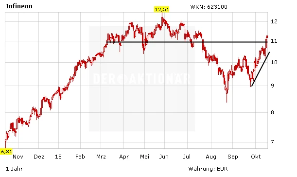 Die Infineon-Aktie hat den Widerstand bei 11 Euro überwunden. Das Chartbild hat sich dadurch weiter verbessert. Auch ohne die Fairchild-Gerüchte stimmen die Aussichten. Vor allem in der Automobilindustrie dürfte die Nachfrage nach Produkten des Konzerns weiter anziehen. Die jüngste Kaufempfehlung des AKTIONÄR zahlt sich zunehmend aus. Anleger lassen die Gewinne laufen. Das Chartbild lässt auch noch immer einen Neueinstieg zu.