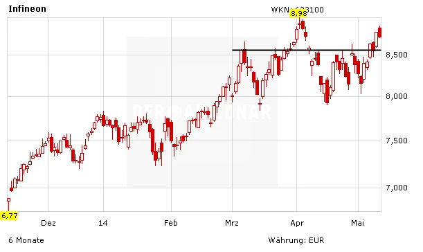 Die Aktie des Chipherstellers Infineon ist über den wichtigen horizontalen Widerstand bei 8,60 Euro geklettert. Damit wurde ein neues Kaufsignal ausgelöst, das weitere Käufer anlocken dürfte. Für zusätzlichen Rückenwind sorgen positive Analystenstimmen.