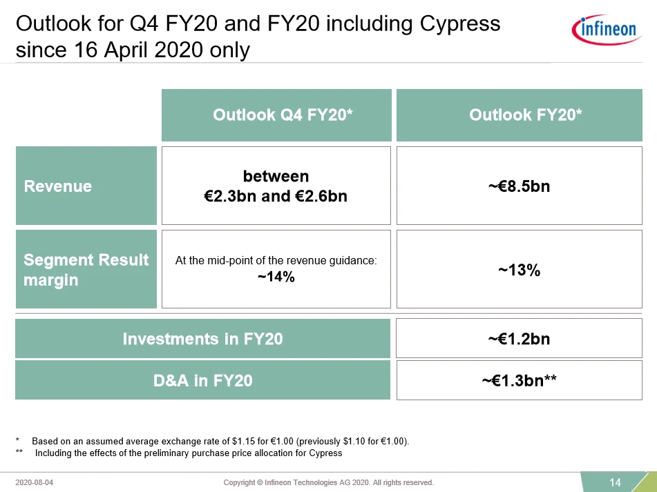 Unter dem Strich stand aber ein Fehlbetrag von 128 Millionen Euro zu Buche, nach einem Gewinn von 224 Millionen Euro ein Jahr zuvor. Dennoch: Der Ausblick auf das vierte Quartal überrascht positiv. Für das laufende Geschäftsjahr 2019/2020 (Ende September) erwartet der Dax-Konzern jetzt einen Umsatz in Höhe von rund 8,5 Milliarden Euro sowie eine operative Marge (Segmentergebnis-Marge) von etwa 13 Prozent. Bislang hatte Infineon für das kombinierte Unternehmen mit dem US-Halbleiterspezialisten Cypress Semiconductor mit Erlösen in Höhe von rund 8,4 Milliarden Dollar und einer operativen Marge etwa zwölf Prozent gerechnet.
