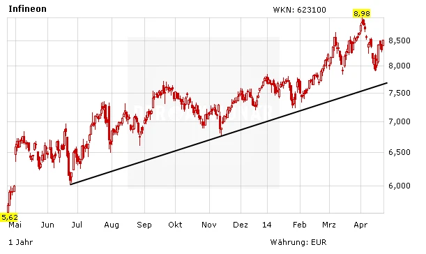 Experten rechnen im Vergleich zum Vorjahreszeitraum mit einem deutlichen Anstieg des Nettogewinns von 33 auf über 109 Millionen Euro. Beim Umsatz dürfte die Milliardenmarke (Q2 2013: 920 Millionen Euro) erreicht werden. Auch der Ausblick auf das Gesamtjahr dürfte bestätigt werden. Bereits auf der Hauptversammlung Anfang April kündigte Konzernchef Reinhard Ploss ein „deutliches Plus bei Umsatz und Ergebnis“ an. Infineon erwartet eine Umsatzsteigerung um sieben bis elf Prozent von zuletzt 3,8 Milliarden Euro. Der Gewinn je Aktie dürfte von 0,25 auf 0,39 Euro steigen.
