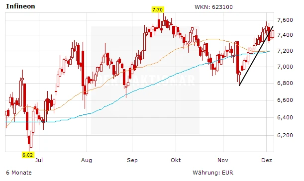 Die Korrektur an den Aktienmärkten ist auch an der Infineon-Aktie nicht spurlos vorbeigegangen: Der Titel ist unter die kurzfristige Aufwärtstrendlinie gerutscht. Aus charttechnischer Sicht rückt damit der 38- und der 90-Tage-Durchschnitt – beide verlaufen aktuell im Bereich von 7,20 Euro – in den Blick.