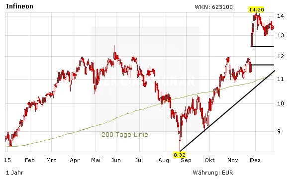 Seit dem Jahreshoch bei 14,20 Euro hat die Infineon-Aktie Federn lassen müssen. Ist es für investierte Anleger jetzt an der Zeit, die Gewinne mitzunehmen?
