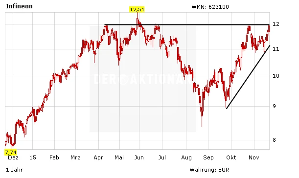 Bei Infineon spitzt sich die Spannung immer mehr zu. Dank der Kursgewinne am Freitag notiert die Aktie des Chipherstellers inzwischen unmittelbar an der wichtigen 12-Euro-Marke. Im Fokus stehen zum einen die Zahlen, die kommenden Donnerstag, den 26. November veröffentlicht werden. Zum anderen sorgt das Interesse am japanischen Rivalen Renesas für Aufsehen.